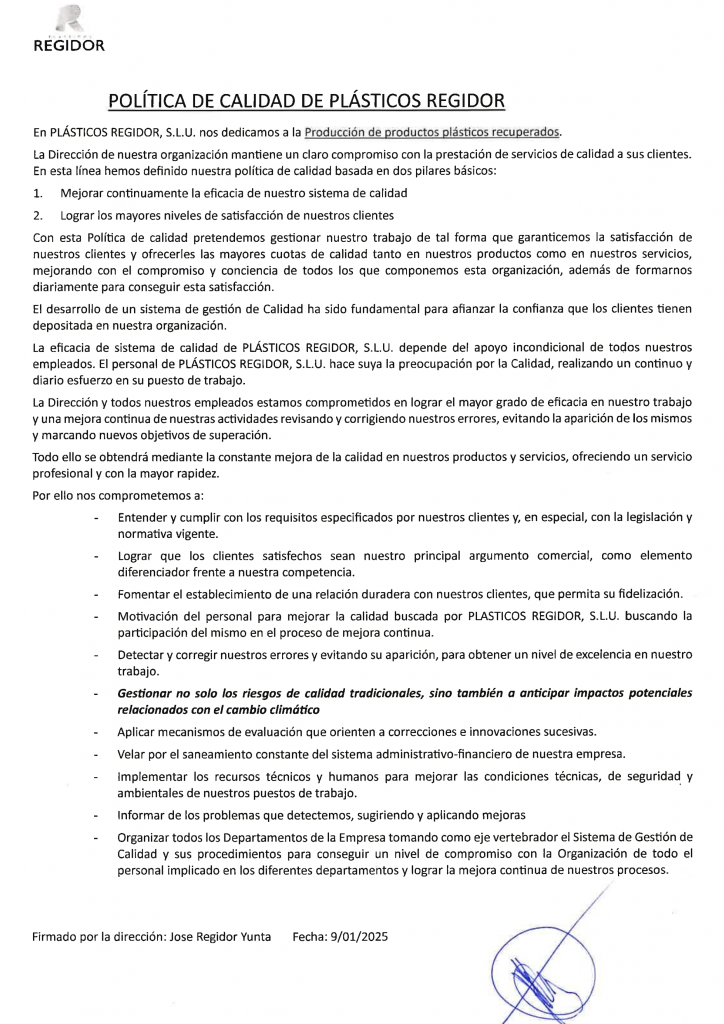 Plásticos Regidor, S.L.U. cuenta con un sistema de gestión de calidad certificado conforme a la norma ISO 9001:2015, otorgado por Applus+. Esta certificación es un reconocimiento a nuestro compromiso constante con la excelencia y la mejora continua en todos los procesos que conforman nuestra actividad empresarial.